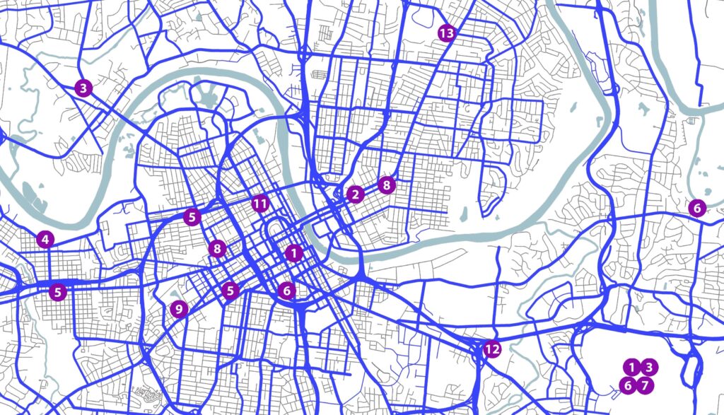 The map above shows all of the main spots, except the food trucks, like Hurts Key for the map. As much as possible, I have them in the order they were founded (and ignored any now defunct). Prince’s Hot Chicken